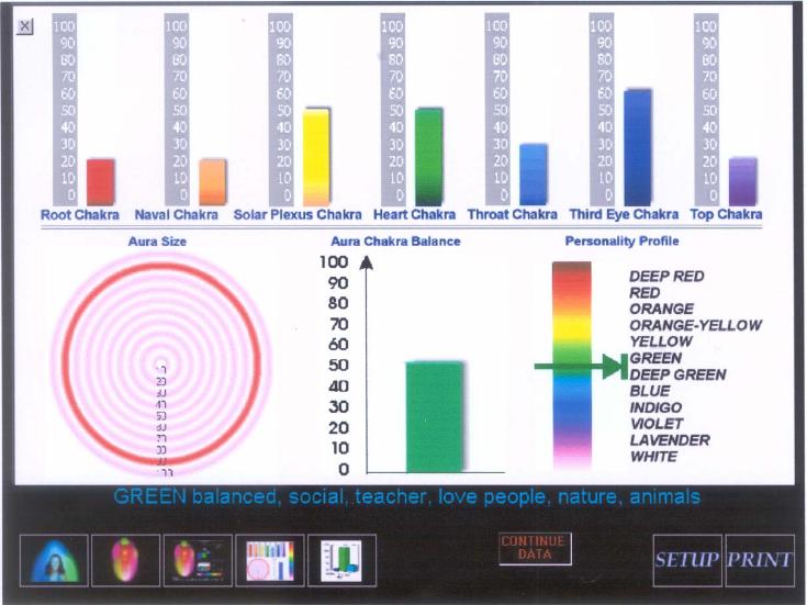Aura Locations and Chakra Shapes LEFT SIDE (FEMALE-YIN) The color on the left side is normally the vibration coming into the being. It is what one feels inside but might not have expressed. ABOVE HEAD (THOUGHTS-BELIEFS) The color over the head is what you experience right now. It reflects what one thinks or believes at that moment, and shows the current state of mind. RIGHT SIDE (MALE-YANG) The color on the right side is traditionally the energy being expressed, as well as the qualities most likely seen or felt by others. It is what you are putting out to the world. CENTER (BASE AURA COLOR) The most dominant aura color is seen in the center of your body. This base aura color helps determine one's personality type and does not change as fast as the outside colors. DARK, MUDDY OR MULTIPLE AURA COLORS One might be stressed, tired or experiencing emotional problems; or one may be in a period of tremendous growth and change reflected by several aura colors. CHAKRAS The shape, size and intensity of the color of each chakra reflects various physical, emotional, mental and spiritual states within the aura. ROUND CIRCULAR CHAKRAS SHOW A BALANCED ENERGY SYSTEM Non-circular, blurred chakrs show an imbalance in one's energy centers. Also look at the color and brightness of each chakra for a more detailed analysis. Bio-Data Graphs BIO DATA ANALYSIS The bio-data graphs and meters titled "Aura/Chakras Measurements" reflect important parts of the energetic body system. The color wheel gives an overview of the complete aura color range. This graph also indicates the yin/yang balance. The short needle reflects the yin-female-left qualities, the long needle the yang-male-right qualities of the energy system. STRESS/RELAXATION GRAPH The relaxation graph shows the physical relaxation or stress level, and is mainly based on body temperature. The left blue bar is used as a baseline (environment.) The green bar and left top value show the personal relaxation level. ENERGY LEVEL GRAPH The energy level graph shows the different energy channels that are measured, and is based on the electro-dermal activity. MIND-BODY-SPIRT GRAPH This mind-body-spirit graph gives an overview of how the energies are distributed between body, mind and spirit. EMOTIOMETER The emotiometer shows realtime emotional reactions, true thoughts and inner feelings. MIND-BODY GRAPH The state of mind-body graph displays the overall mind/body condition, and is based on the body temperature. |